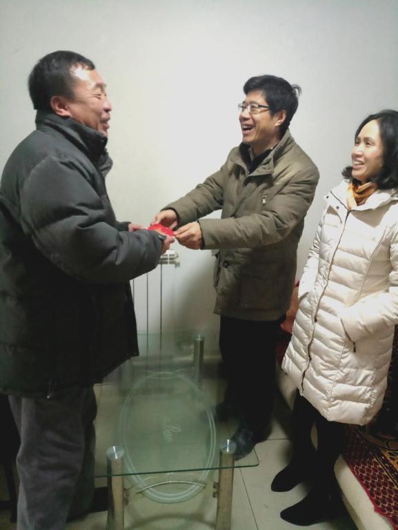 在员工家中,朱传武书记首先代表学校和学院向困难员工家长发放600元慰问金和花生油、米、面等生活必须品,为员工送去关心和温暖。随后,朱书记与员工家长和员工本人进行了亲切交谈。在谈论到员工专业时,朱书记从保险专业的学科设置、就业前景和保险行业发展对人才的需求等方面耐心地向家长加以介绍,增强家长对学校和专业的认同感。在了解到员工想通过考取研究生提升自己的专业水平时,朱书记细致地向员工分析了近几年考研情况,勉励员工认真学习、积极准备、多向考上的学长学姐取经、努力考上理想学校。张书记则从保险和精算专业在考研时注意的问题入手,鼓励员工根据自身的实际情况和学业特长选择适合自己的考研专业和学校。家长和员工本人对学院领导和老师们的关心和帮助表示感谢,同时员工也表示今后一定努力学习,不辜负老师和父母的期望。