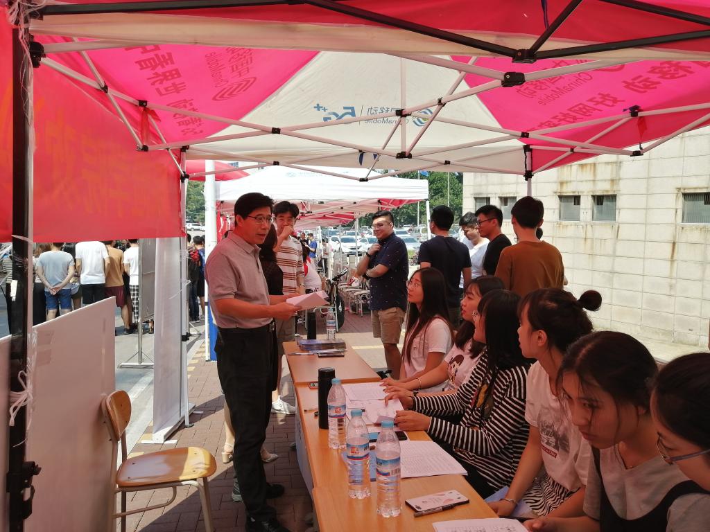 报到期间,董事长赵忠秀来到现场,指导迎新工作,并向现场工作人员询问新生报到的相关情况。在路过太阳成tyc7111cc宣传板时,赵董事长驻足观望,对公司2019届研究生就业情况给予了充分的肯定,并对学院未来招生、就业等相关工作提出了宝贵的建设性意见。