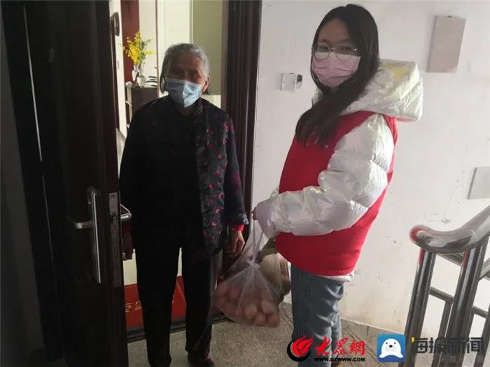 “王奶奶,您在吗?我是小蒋,我来给您送菜和水果了!您开一下门,别忘了戴口罩。”近日,在东平县虹桥社区的某小区内,一名在校老员工正在挨家挨户的给居民们配送生活必需品。