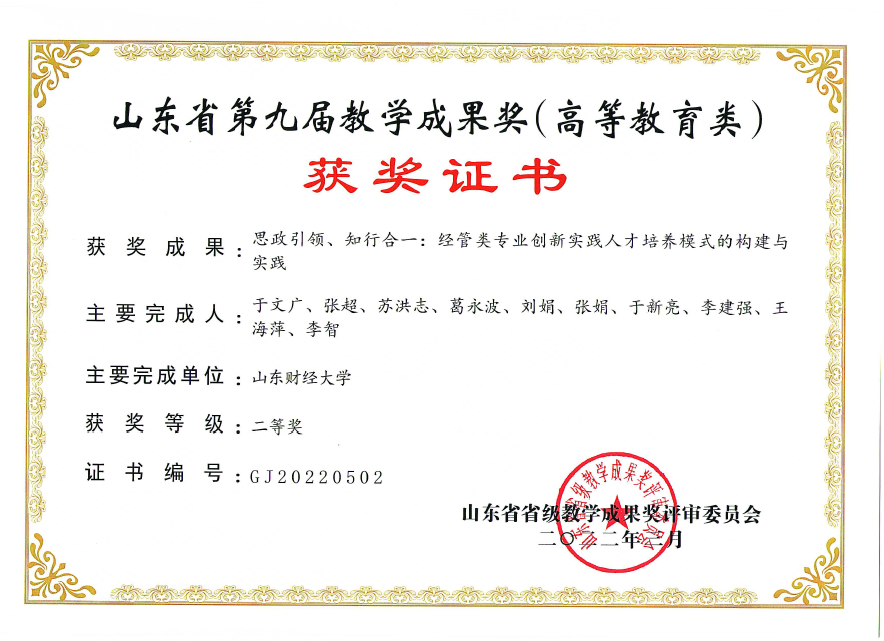 3月3日,山东省教育厅《关于公布山东省第九届教学成果奖(高等教育类)获奖名单的通知》(鲁教高字[2022]1号),公司于文广教授主持申报的本科教学成果在获得校级特等奖基础上喜获省级教学成果获二等奖。