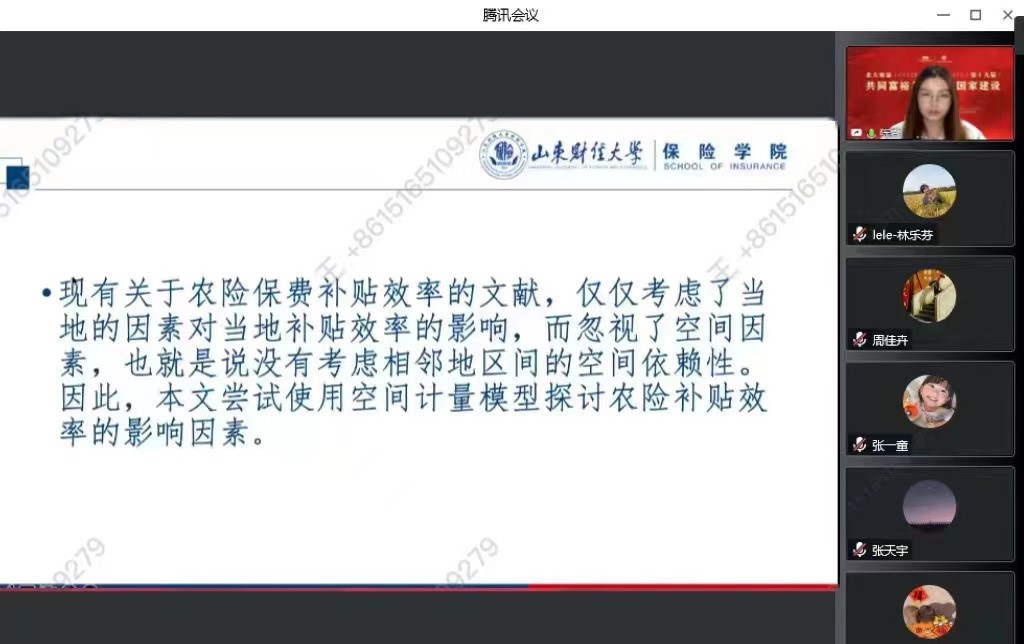 本届论坛主题为“共同富裕与现代化国家建设”,10月28日下午为六场学术分论坛报告,10月29日上午为大会演讲。公司于文广教授主持“保险与经济社会”学术分论坛,于新亮教授与范红丽副教授分别对参会论文做出点评。另外,付红副教授指导的硕士生陈睿在“保险业务经营”分论坛报告了论文《农业现代化对农险保费补贴效率的影响及其空间溢出效应》。