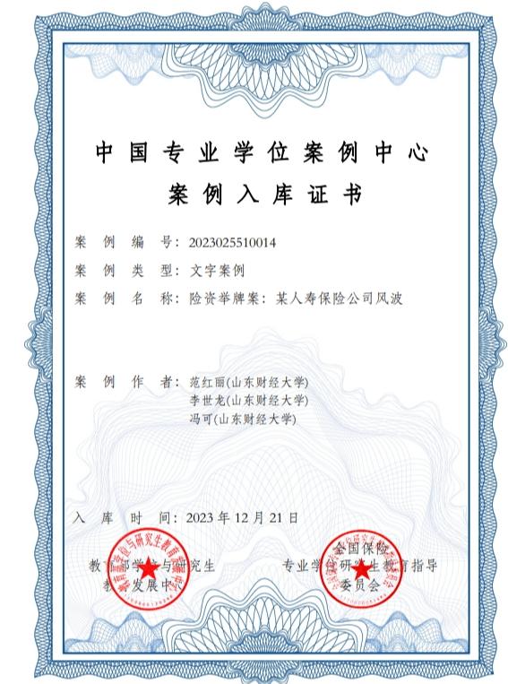 公司范红丽教授、李世龙教授和研究生冯可共同撰写的案例《险资举牌:某人寿保险公司风波》入选全国保险专业学位案例中心案例库。入选的优秀教学案例在全国保险专业学位公司产品单位中共享,而且被收录入由教育部学位与研究生教育发展中心主办的“中国专业学位案例中心”保险案例库,成为国家级的教学案例。