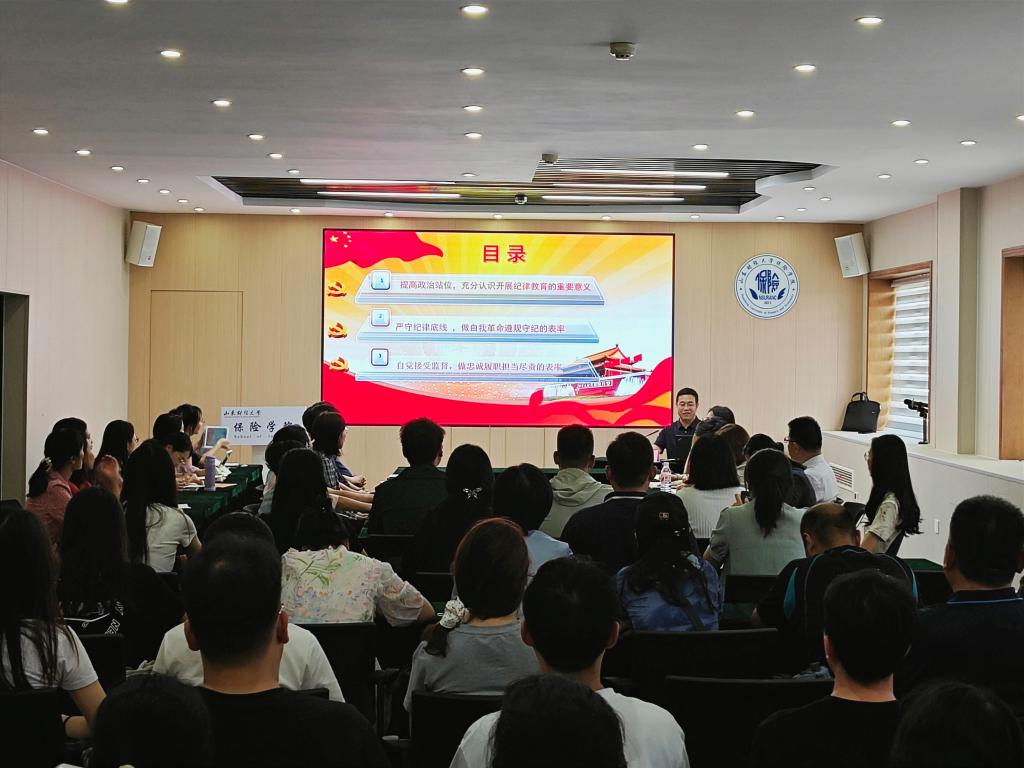 王剑通过对新修订《中国共产党纪律处分条例》的解读和反面典型案例剖析,警醒师生党员要时刻保持清醒头脑,严守底线,不越红线,不碰高压线;要坚持不懈用习近平新时代中国特色社会主义思想凝心铸魂,深刻领悟习近平总书记关于党的自我革命的重要思想,加强党性锻炼、筑牢对党忠诚,规范权力运行、奋发担当作为,做忠诚干净担当的表率。他特别指出,作为未来的保险行业接班人,同学们尤其是毕业生党员要从现在做起,加强理论学习、坚定理想信念、砥砺家国情怀,从小事做起,从小处着手,将清廉理念内化于心、外化于行。