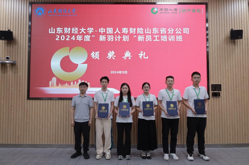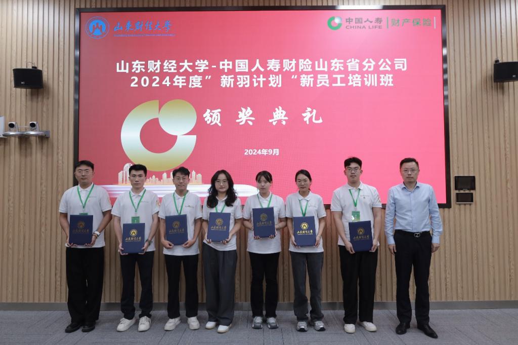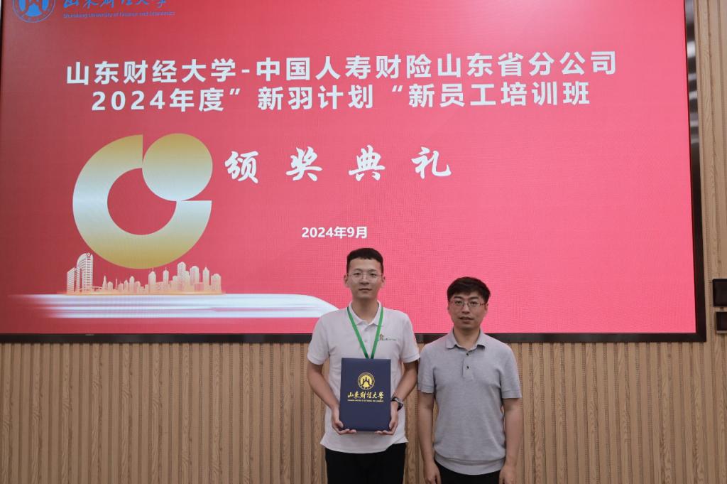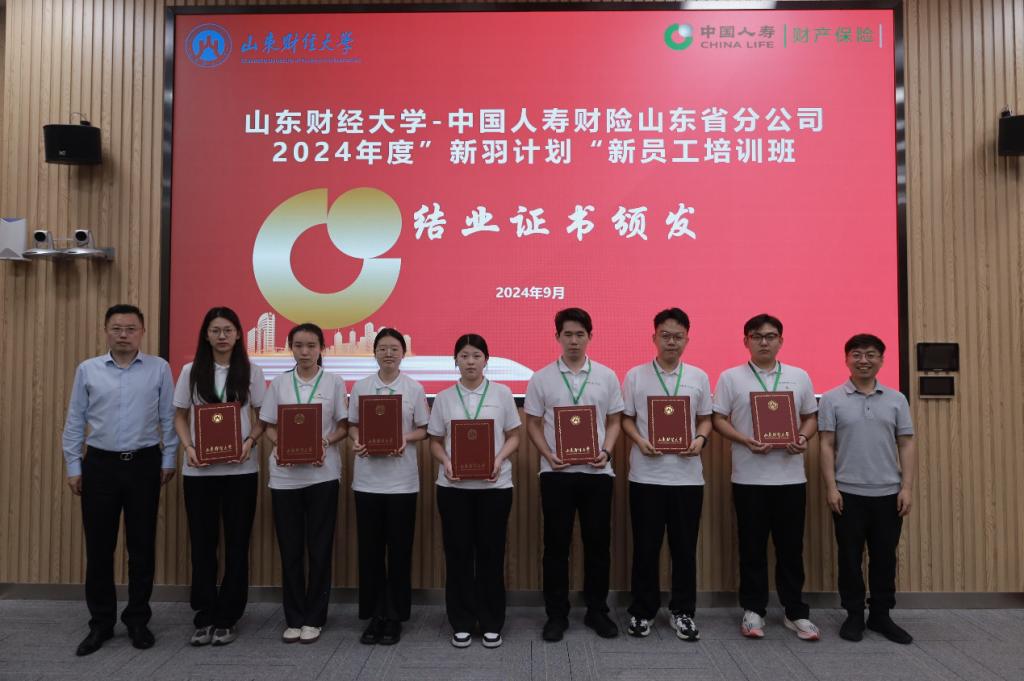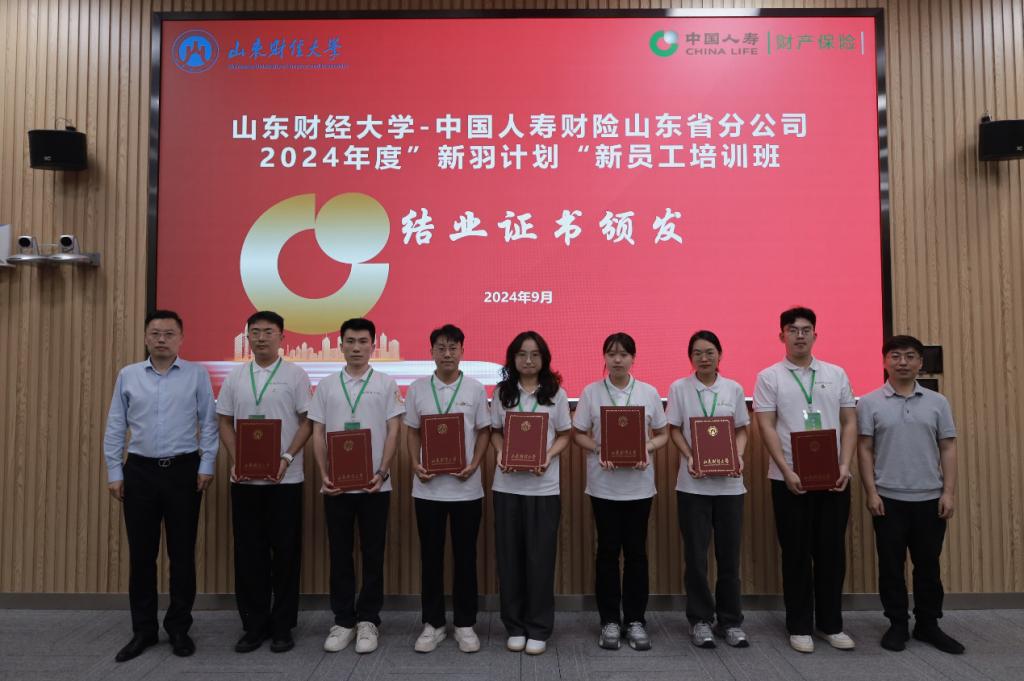 在结业证书颁发环节,郭永浩总经理、于新亮副经理为参加中国人寿财险山东省分公司2024年度“新羽计划”新员工培训班并顺利结业的各位学员颁发了结业证书。