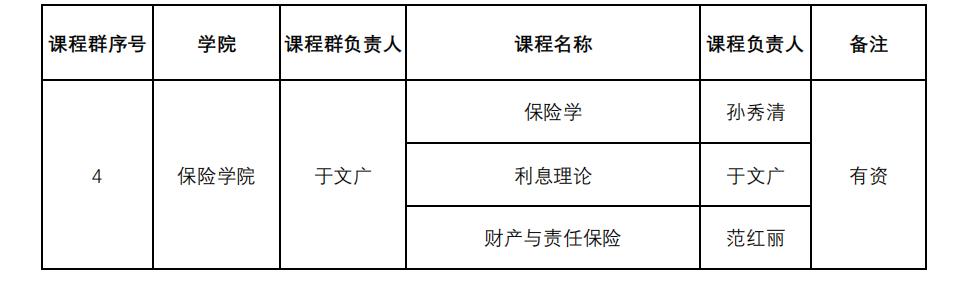 保险学与精算学智慧课程群以学院经理于文广为总负责人,由《保险学》《利息理论》和《财产与责任保险》三门核心基础课程构成,分别由孙秀清、于文广、范红丽领衔,组建包括老中青教师及技术支持人员的联合工作组,负责课程群的规划、实施与评估。立项实施后将明确各阶段的工作目标、任务分工、时间节点及预期成果,确保课程群建设有序进行。